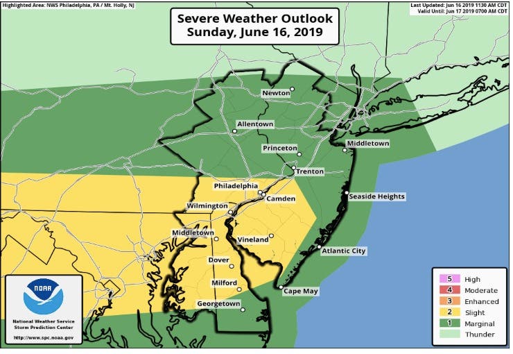 The NWS, meanwhile, has issued a hazardous weather outlook for nearly all of New Jersey, saying there is a chance for severe weather across the state on Father's Day. Damaging winds and large hail are the main threats.