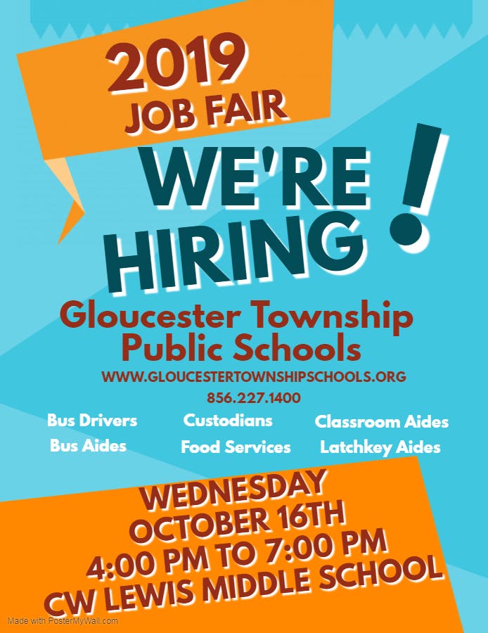 GLOUCESTER TOWNSHIP, NJ — The Gloucester Township K-8 Public School District will host its 2019 Job Fair in two weeks. The fair will take place on Wednesday, Oct. 16, 4 p.m. to 7 p.m. at the C.W. Lewis Middle School.