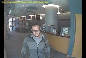 The suspect entered the Susquehanna Bank on the first block of Market Street through the building’s Delaware Street entrance and passed a demand note to a teller around 3:20 p.m.