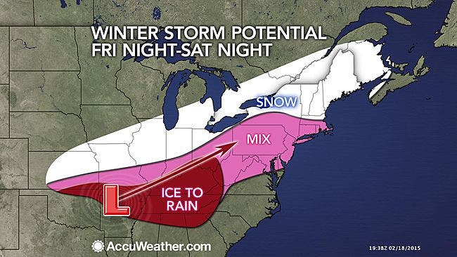 The storm is likely to transition from snow to ice and rain along the mid-Atlantic and southern New England coasts. However, just enough cold air may linger near the ground to cause an extended period of icing farther inland, according to Accuweather.