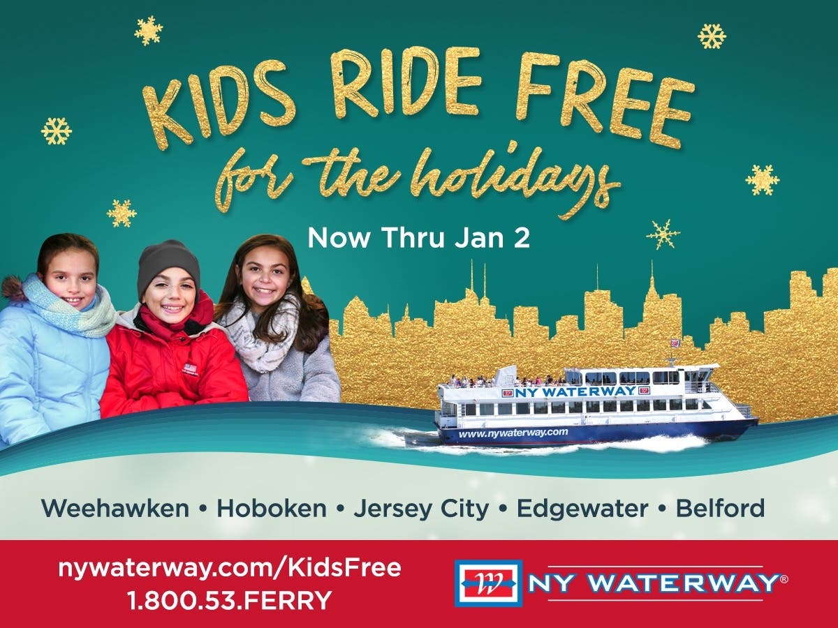 · Kids under 12 can ride on NY Waterway’s ferries for free on all routes beginning Friday, Nov 26, 2021 through Sunday, January 2, 2022. The ticketing policy for the service is: 2 children are permitted to ride free per each paying adult rider.