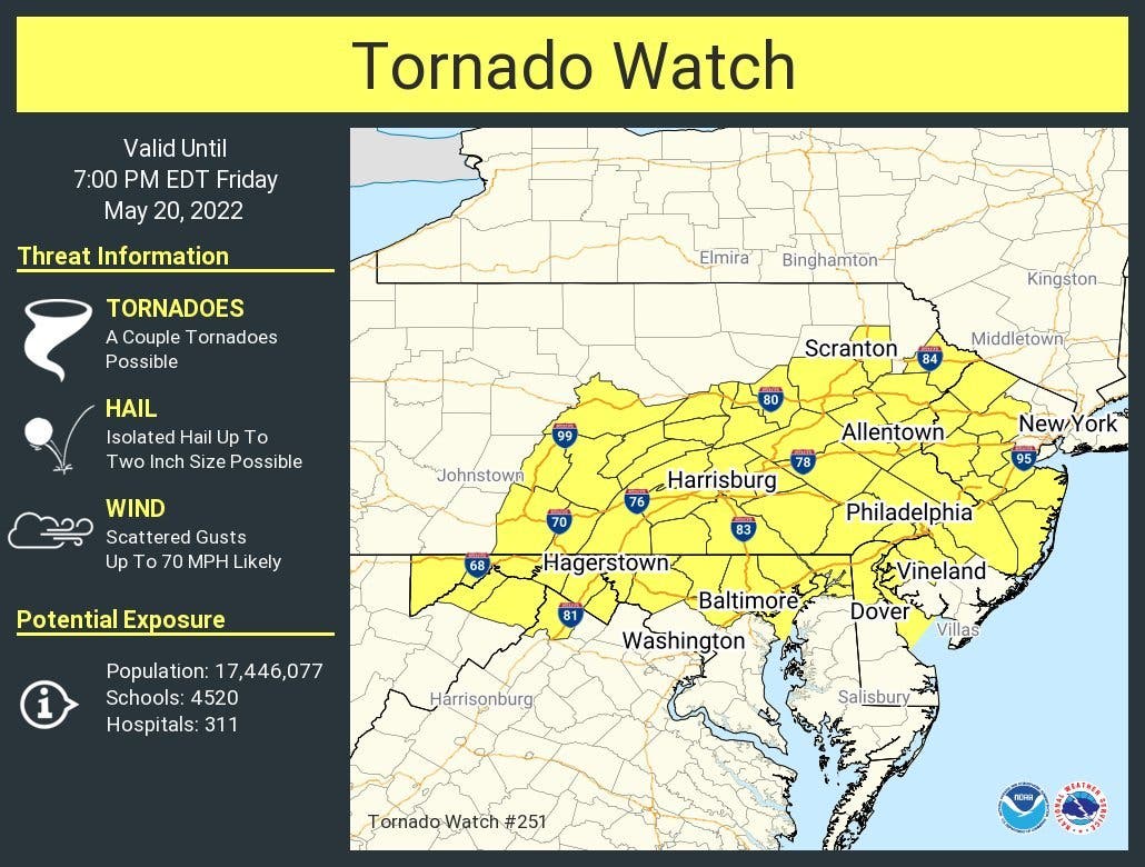 NEW JERSEY — Weather officials placed 13 New Jersey counties under a tornado watch. The National Weather Service's tornado watch remains in effect until 7 p.m. Friday.