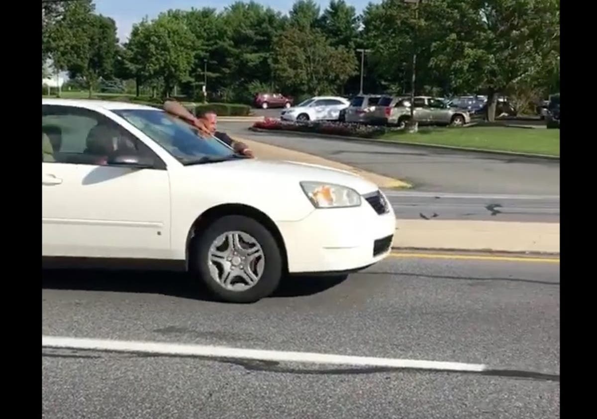 The video from Facebook user Nadia Elizabeth shows Joseph Santos, 44, of Hasbrouck Heights allegedly jumping onto cars, including a police vehicle, across from the Pennsylvania amusement park.