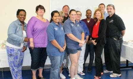 In order of left to right: Direct Support Professionals of The Arc of Somerset County: Sakree Tillman, Manager of Supported Living Program, Debra Aker, Assistant Manager, Padma Rani, Teacher Assistant at The Jerry Davis Center for Children and Families, Karen Bergman, Assistant Manager of Employment Services, Tom Robinson, Maitenance Technician, Michele Reilly, Head Teacher at The Jerry Davis Center for Children and Families, Kathy Shimmel, IHP Coordinator, Gwen Harvey, Direct Service Professional Lauren Panarella, Executive Director, Chris Corvino, Associate Executive Director, Roy Lawrence, Vehicle Fleet Manager
