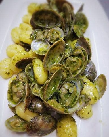 (Fresh gnocci in pesto with baby manila clams)