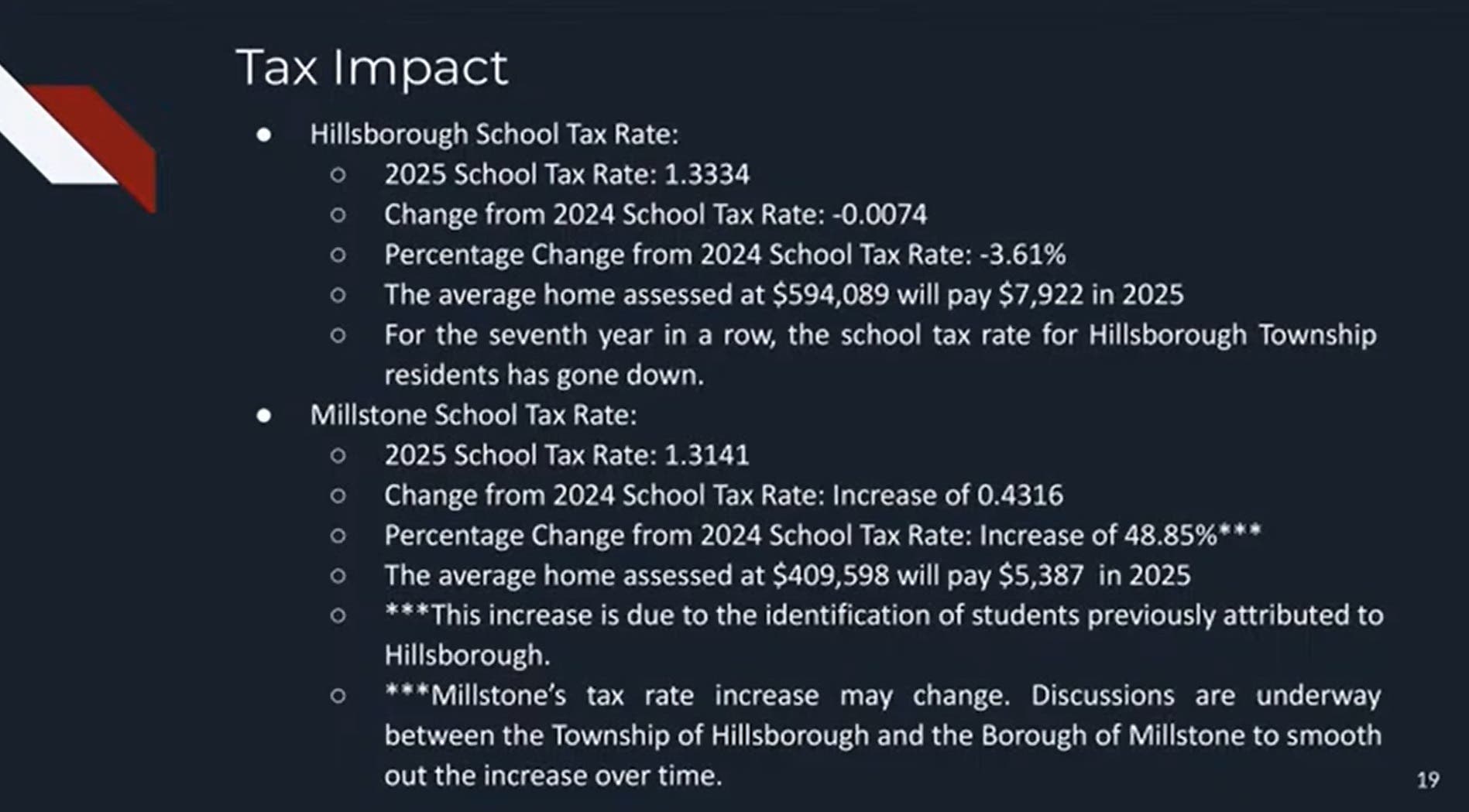 The average home property in Hillsborough Township valued at $594,089 will pay $7,922 in 2025 which is a tax rate decrease of 3.61 percent. The average home property in Millstone valued at $409,598 will pay $5,387 in 2024 which is a tax rate increase of 48.85 percent.
