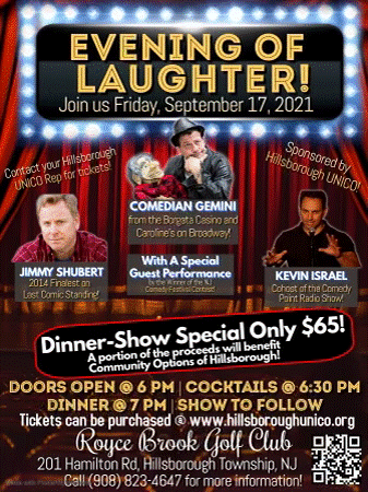 Join Hillsborough Unico for an Evening of Laughter, Friday September 17, 2021. Tickets on sale now at https://hillsboroughunico.org/. This year Hillsborough Unico is donating a portion of the proceeds to Community Options of Hillsborough, a wonderful organizations helping those less fortunate. More information on Community Options can be found at https://www.comop.org/