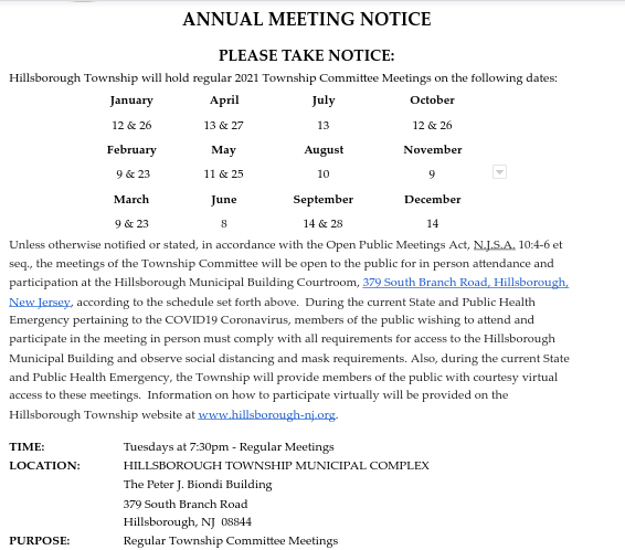 Hillsborough's 2021 Township Committee Meeting Schedule