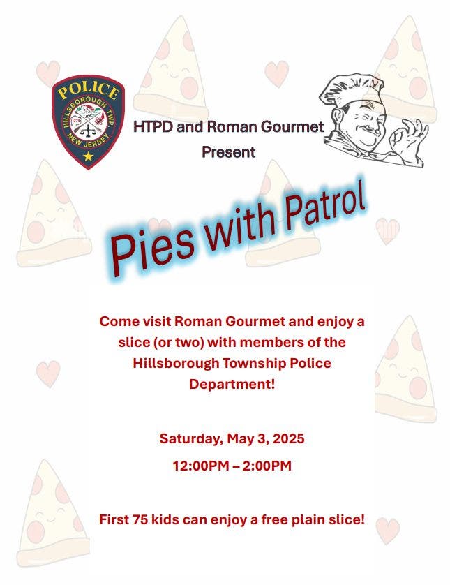 HILLSBOROUGH, NJ — The Hillsborough Police will be at Roman Gourmet this Saturday in a community engagement event called "Pies with Patrol."