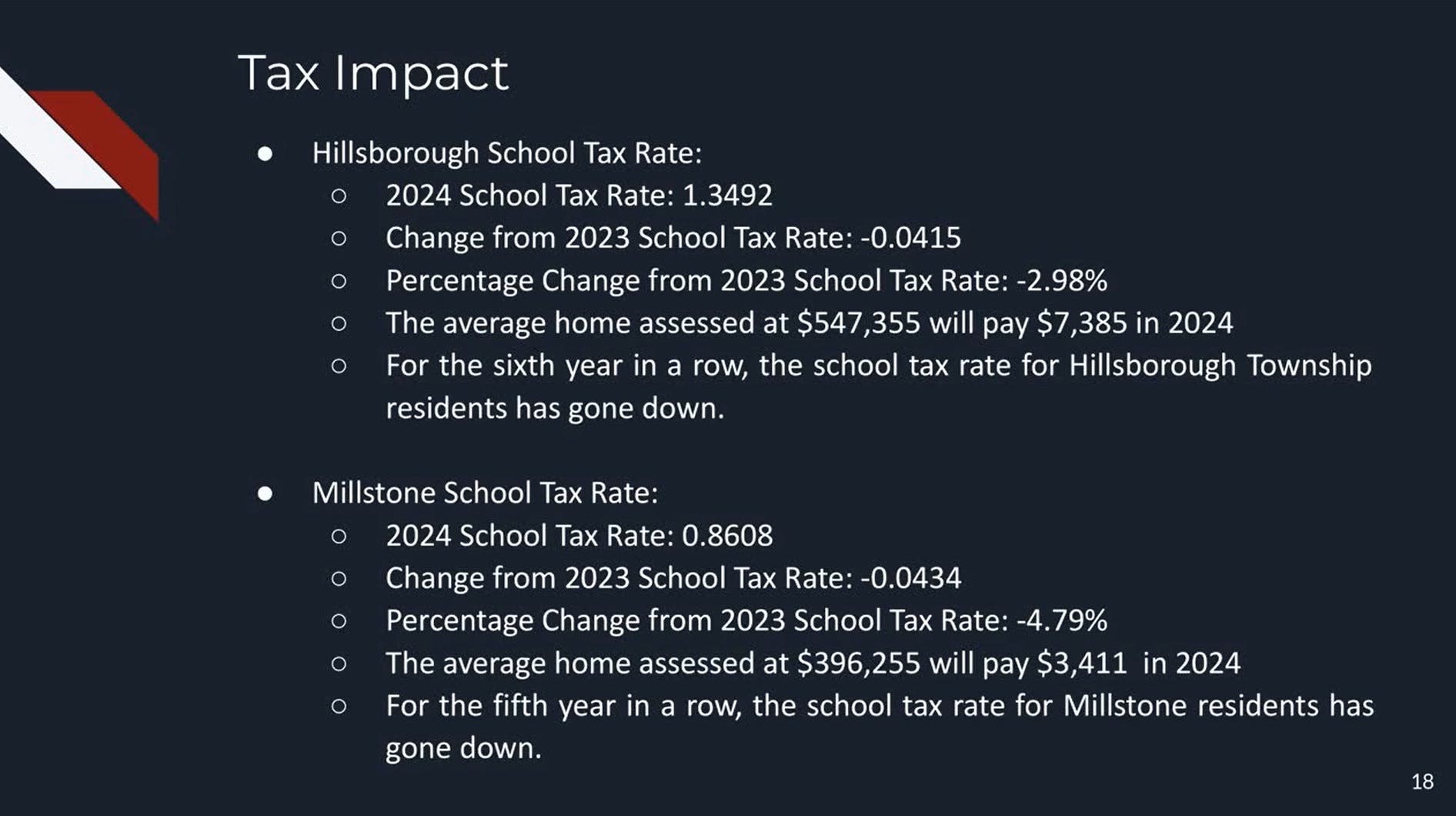 The average home property in Hillsborough Township valued at $547,355 will pay $7,385 in 2024 which is a tax rate decrease of 2.98 percent. The average home property in Millstone valued at $396,255 will pay $3,411 in 2024 which is a tax rate decrease of 4.79 percent.