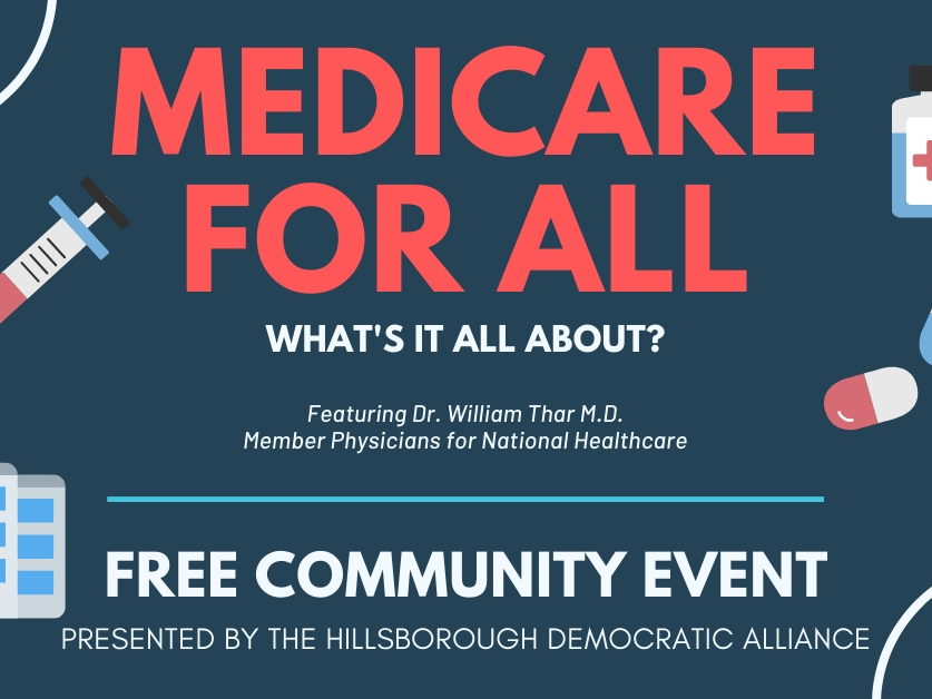 “While we don’t hold an official position on the issue, the fact remains that healthcare is a major concern across our community and the country,” Hillsborough Democratic Alliance President, Steve Pick said. “We are pleased to present this informational event for the benefit of residents who would like to learn more about the impact that the Medicare for All proposal could have on their lives, livelihoods, and the American economy in general.”