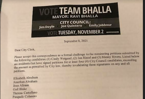 A letter from the Bhalla Team to the Hoboken city clerk dated Sept. 8 challenged signatures on the nominating petitions of Manny Rivera, Cindy Weigand, and Ian Rintel.