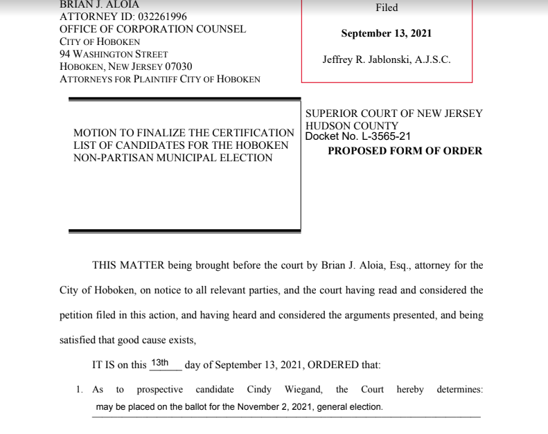 On Monday, Rintel received the court order from Hudson County Superior Court Judge Jeffrey Jablonski saying he and the other independent candidates can remain on the ballot.