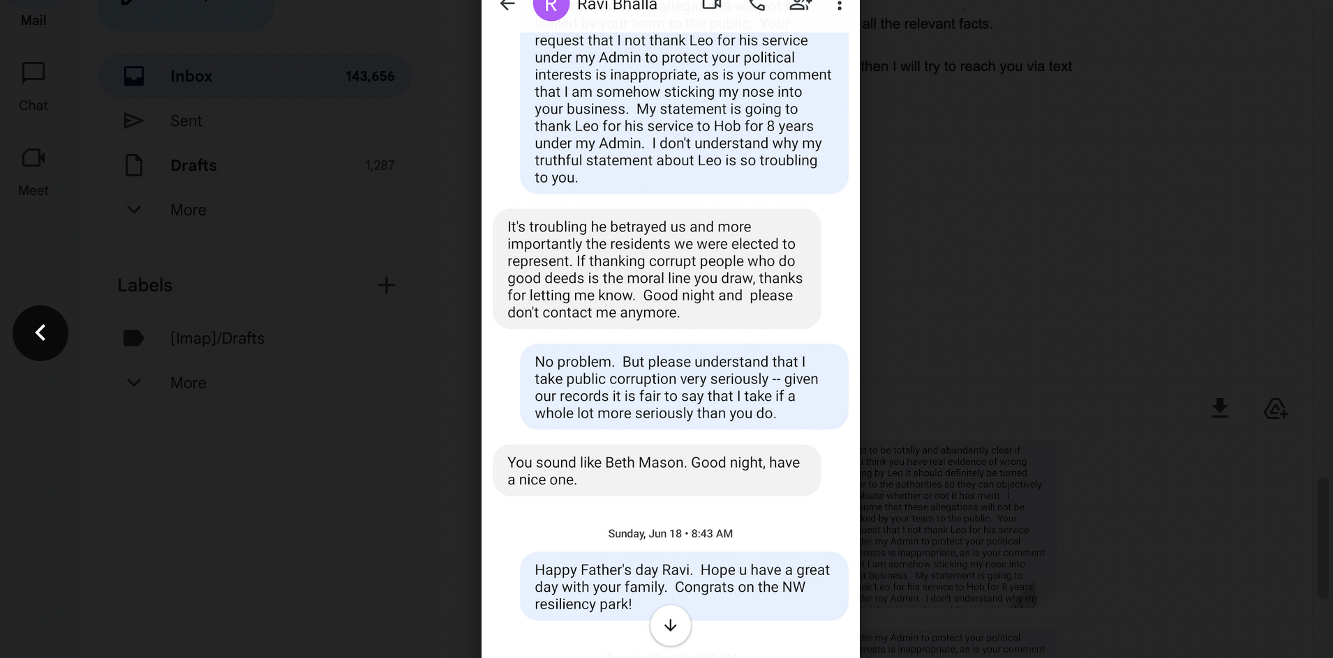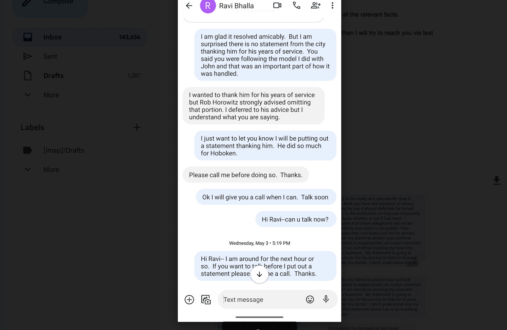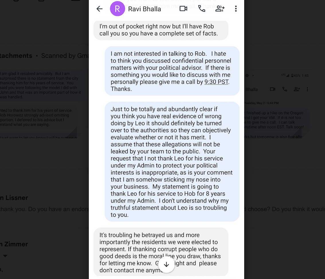 In the texts below, Zimmer's comments are in blue. (Rob Horowitz, who's mentioned in the texts, is a Bhalla political adviser and spokesperson for his current congressional campaign. He does not work as a City Hall or city spokesperson.)