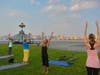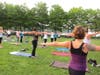 Tuesday night, as the temperature slowly began to creep back and a warm wind set in, a large group convened at Pier A Park for a free outdoor yoga class, the first of a summer-long series.
