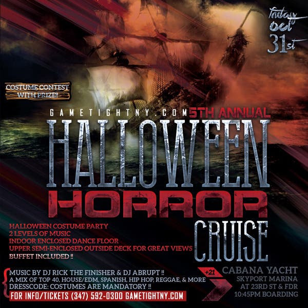 Friday Oct 31st, 2014 – Halloween Horror Yacht cruise at Skyport Marina Cabana boat located at East 23rd st & FDR Drive 10010 NY (347) 592-0300. Music by NYC Hottest Djs! Tickets starting at 20$ + buffet included! Boarding 10:30pm, Sailing at Midnight! For Tickets (347) 592-0300 www.Gametightny.com
