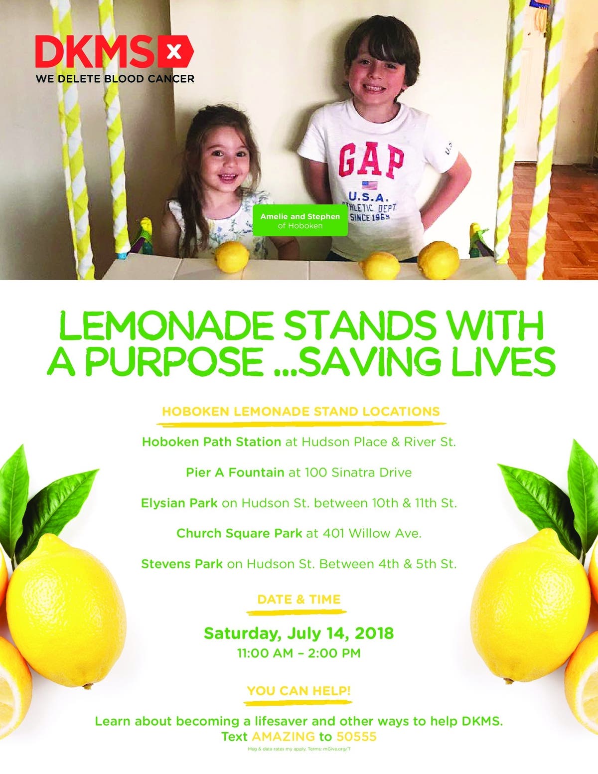DKMS, the “world’s largest bone marrow center,” will be spearheading a lemonade stand fundraiser in Hoboken from 11 a.m. and 2 p.m. on Sunday, July 14.