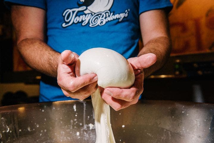Photo: Mike Hauke, owner of Tony Boloney's, shows the handmade process of making mozzarella. Via prnewswire.com.