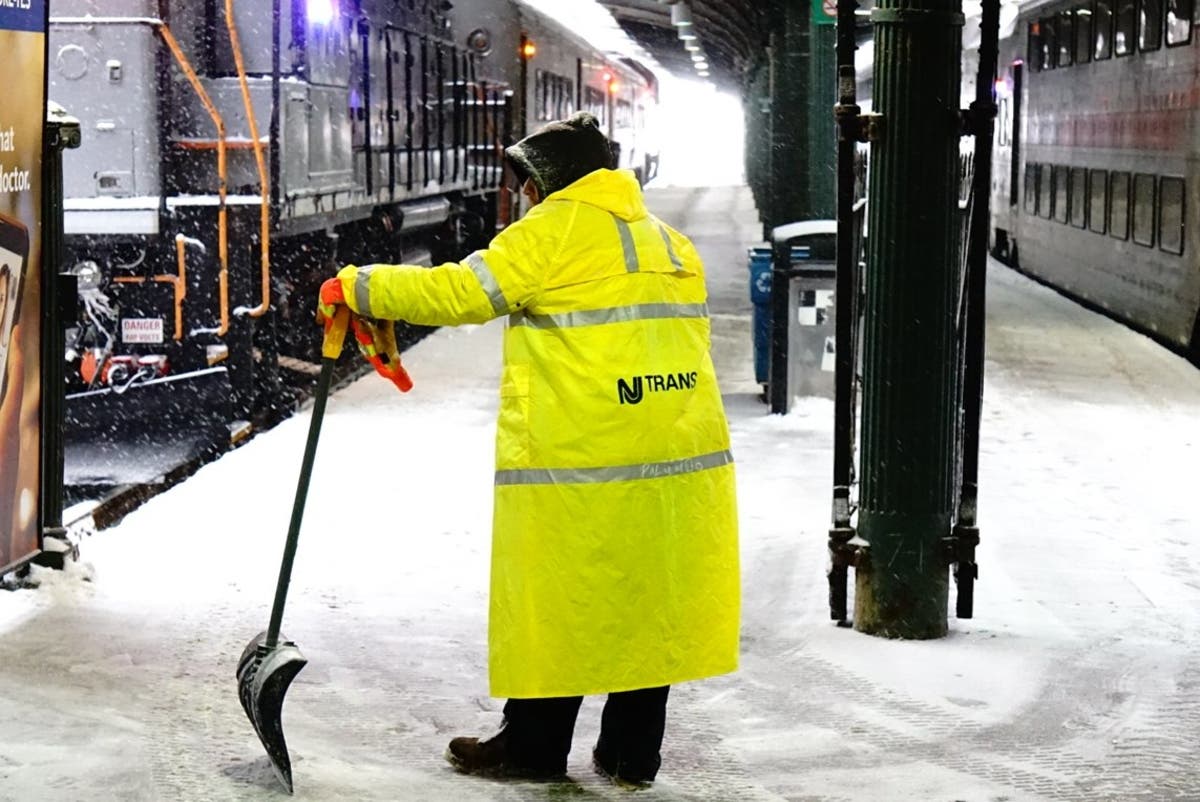Photo: A NJ Transit worker clears snow at Hoboken Terminal (NJ Transit)