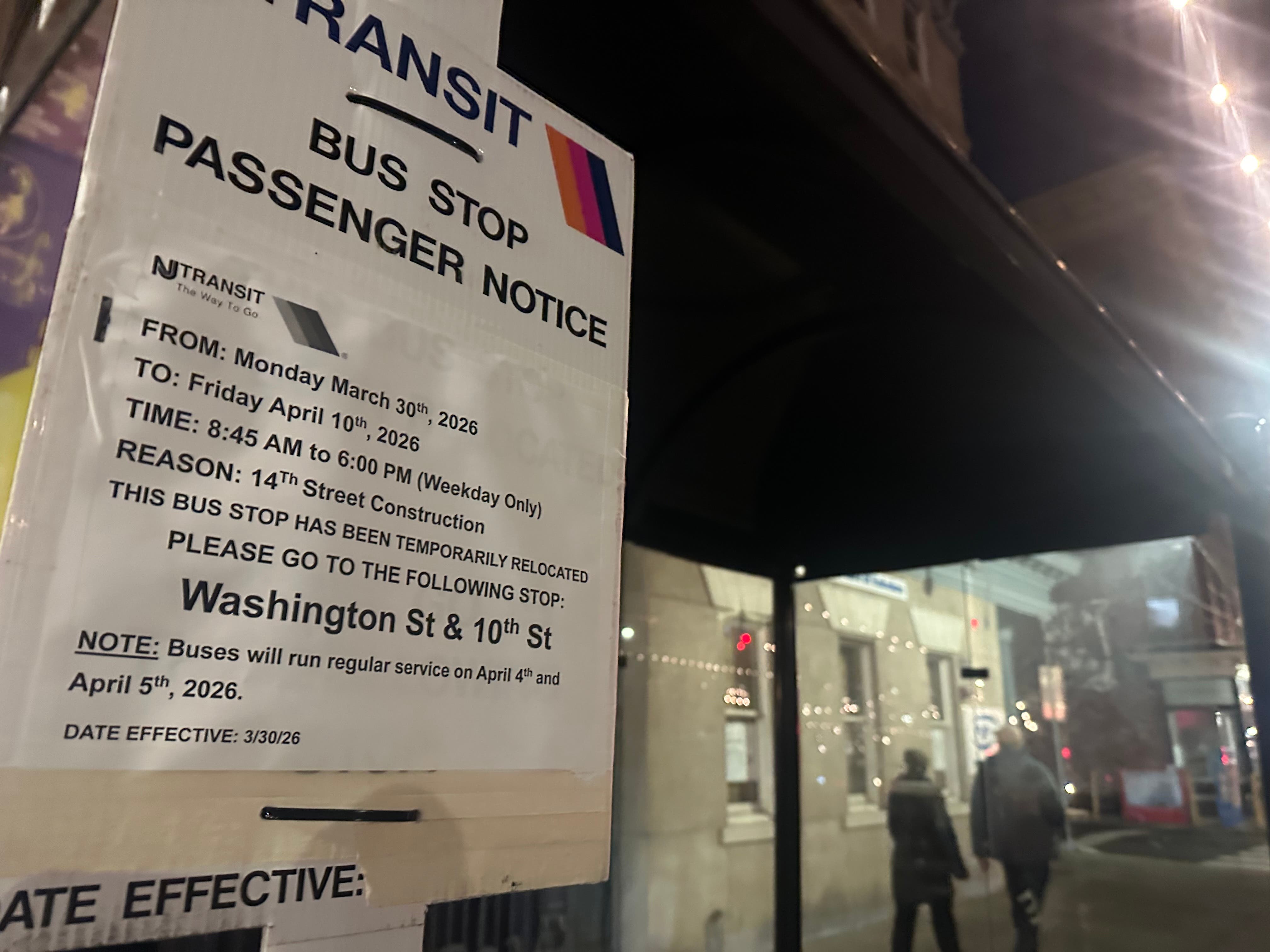 NJ Transit will temporarily relocate the NYC-bound bus stop on the south side of 15th Street to the north side of the Washington Street intersection.