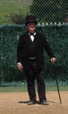 Before the game the lone umpire, who like the players was also dressed in period costume, explained some of the vintage rules. Back then, three strikes made an out but three balls made a walk, fielders could catch fly balls on one bounce for an out, runners could not overrun first base, and all balls hit into fair territory stayed fair even if they rolled into foul territory. The pitchers threw underhand to the batters, known then as strikers, and none of the fielders wore gloves.