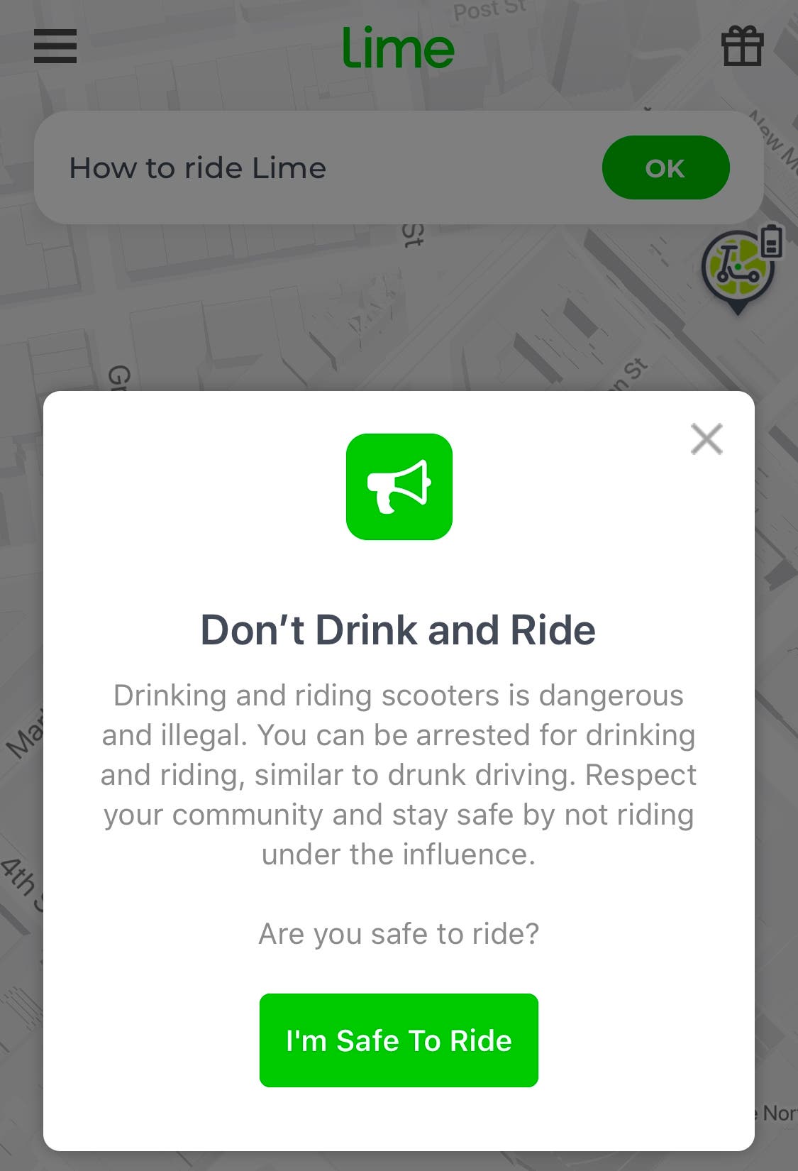 - Lime has an in-app pop-up message (screenshot attached) reminding riders to not drink and ride a scooter