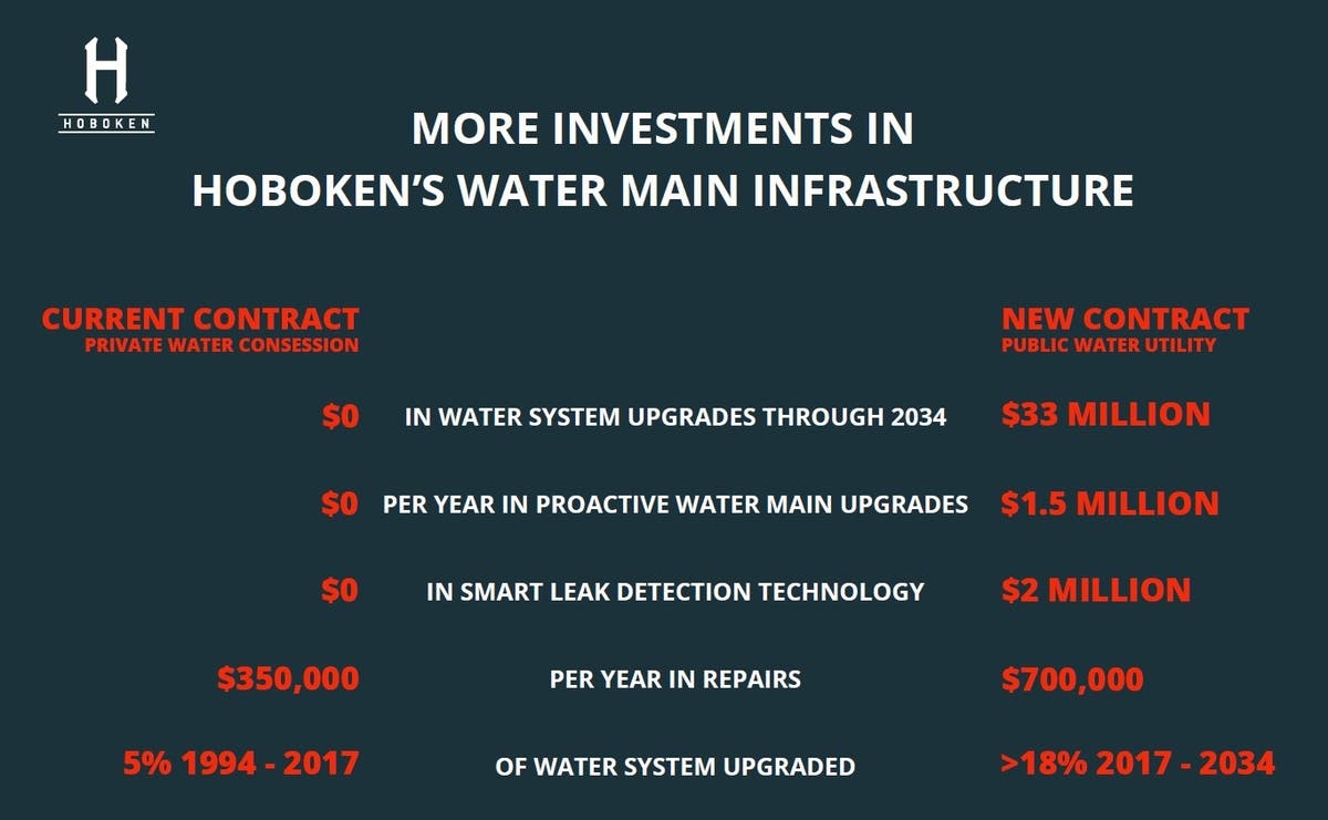 “This contract with Suez provides for unprecedented investments in Hoboken’s water system,” Bhalla said. “Hoboken has been suffering for years with increasing water main breaks due to a previous, woefully inadequate contract that provides for no proactive water main upgrades. The renegotiated agreement will finally allow Hoboken to make the critical upgrades to our water infrastructure that have been badly needed for years. I am hopeful the council will agree and vote in support at Wednesday’s meeting.”