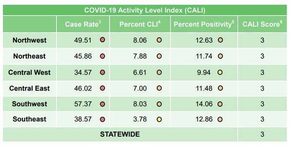 The “red zone” means the daily new COVID-19 virus case rate, per 100,000 people, rose to "very high" in all 21 counties. That means they exceed 25 cases per 1,000 people.