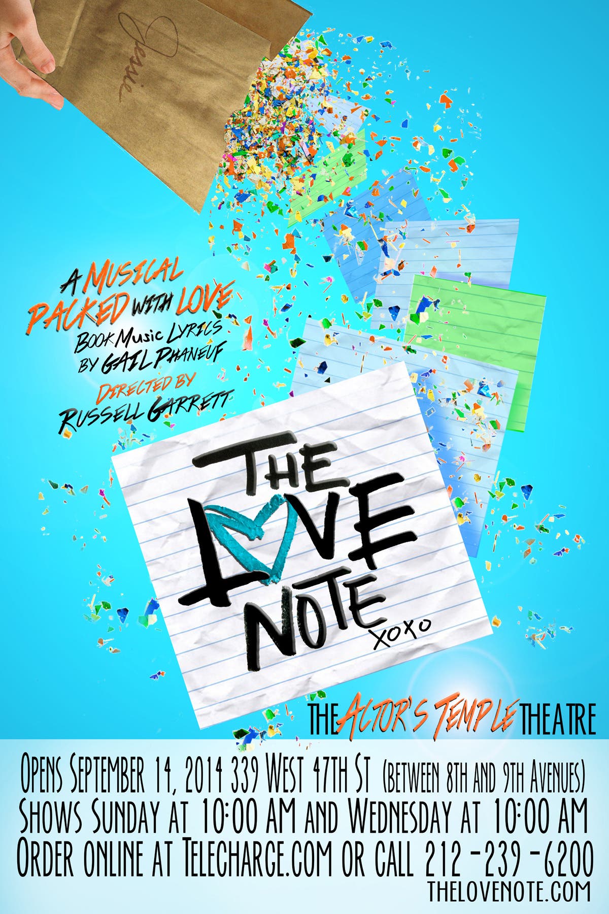 G.P. Productions presents the New York debut of The Love Note, a new pre-teen musical, opening Sunday, September 14, 10 am, at the Actors Temple Theatre, 339 West 47th St, New York, NY. Performances will be held on Wednesdays and Sundays at 10 am through December 21. The Love Note musical, written by playwright/composer Gail Phaneuf, will be directed by Russell Garrett, with music direction by Rachael Ziering, and produced with James Farrelly.