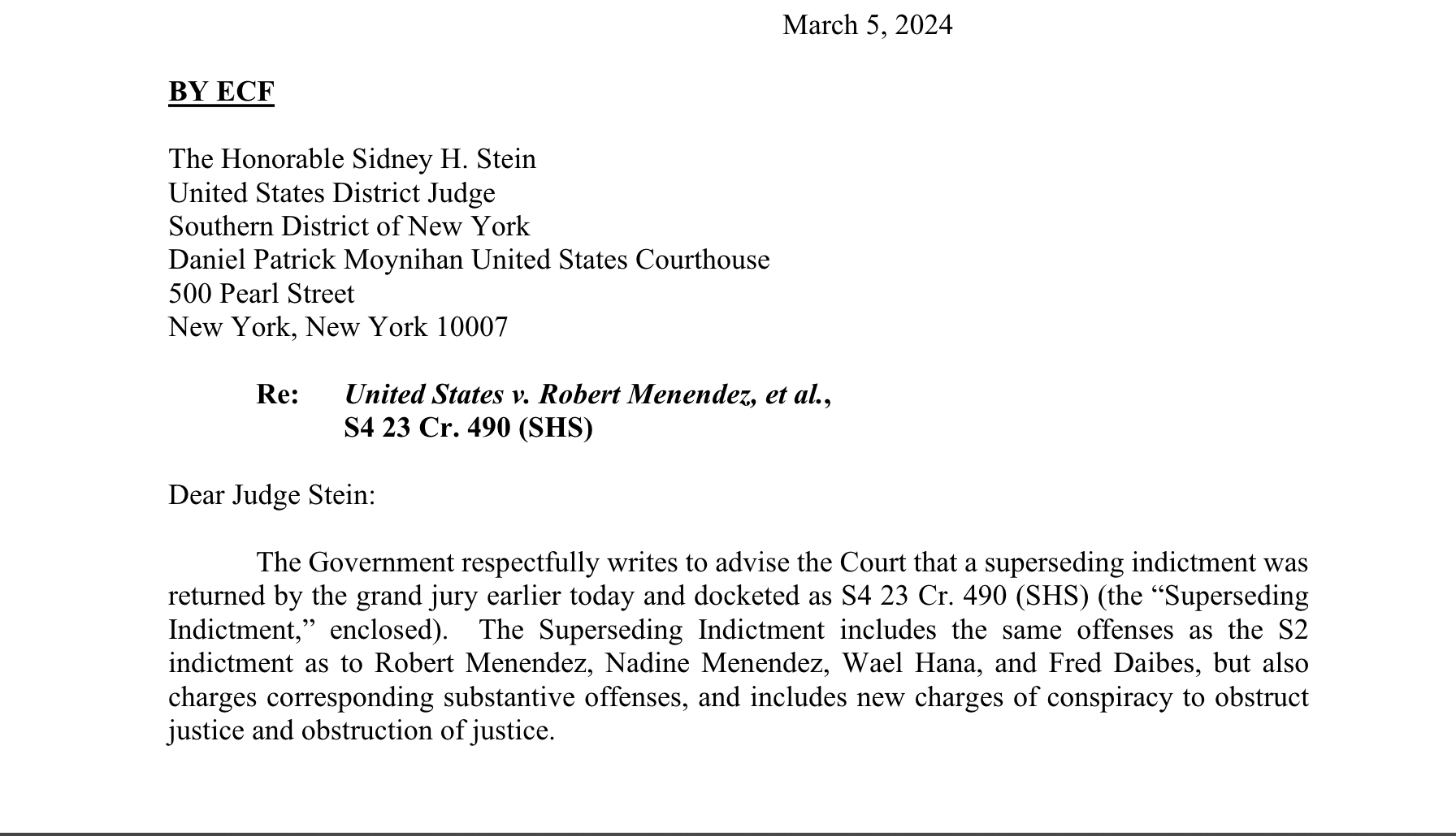 Sen. Robert Menendez and his wife have now been charged with obstruction of justice and another new charge, court documents say.