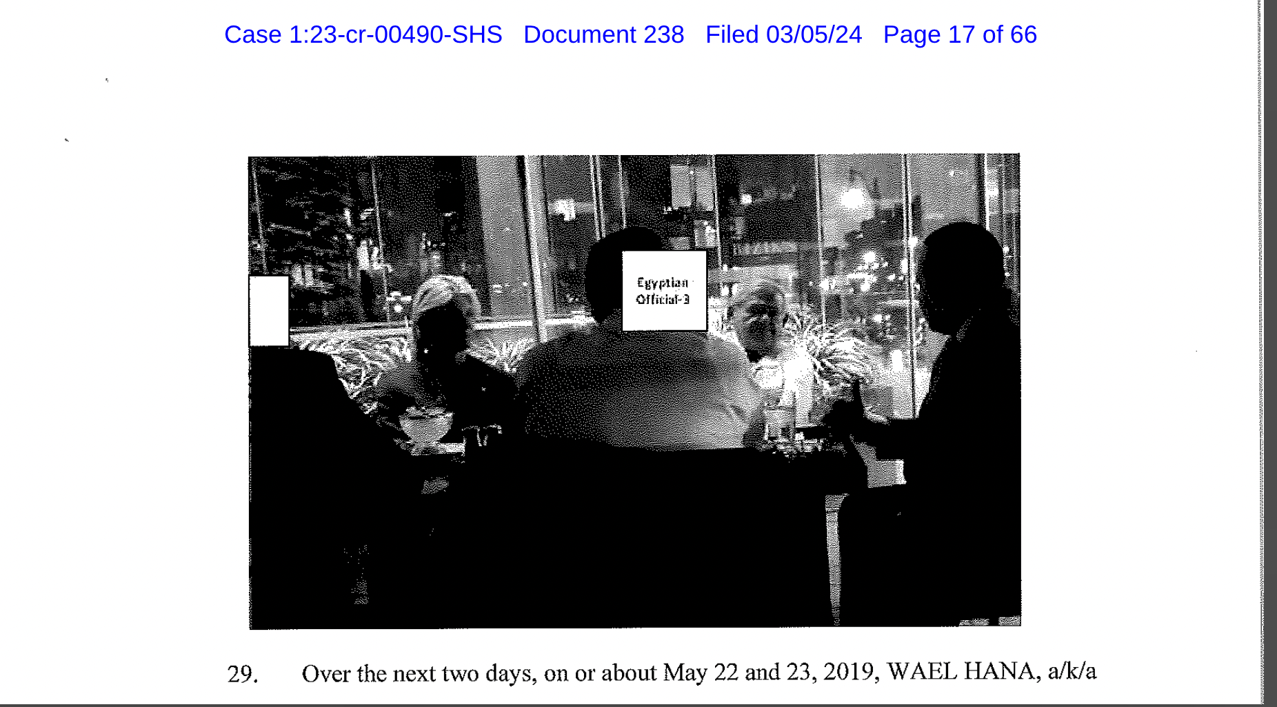 The new indictment details several dinners the couple had with Egyptian officials, including in Edgewater, N.J. Court documents include photos from at least two dinners.