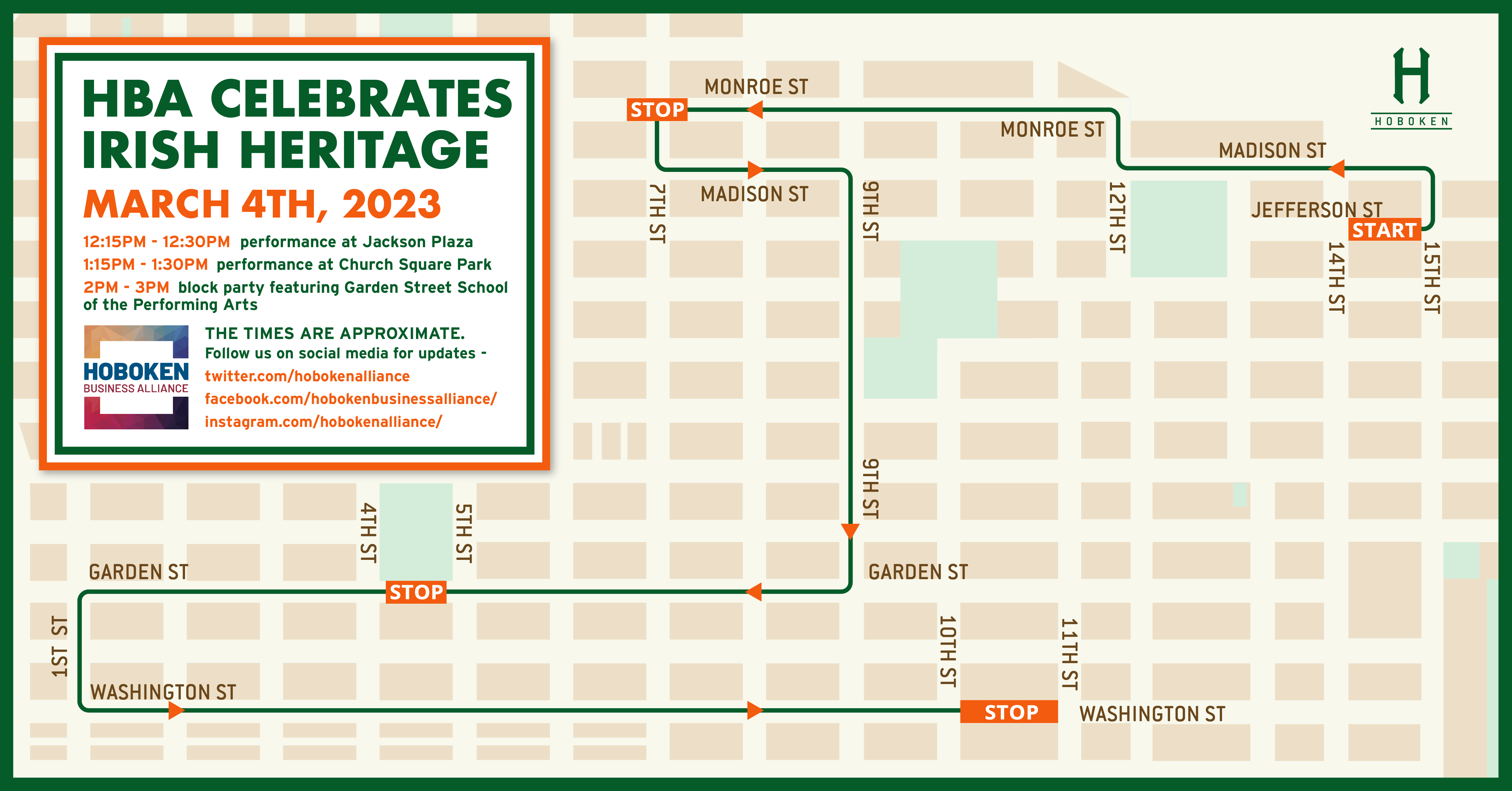 “We are so excited to celebrate the important contributions of Irish immigrants and Irish Americans to the history and culture of the Mile Square City.” Earley added, “This is just the first step in kicking off a spring and summer full of events that aim to energize our community and show everyone that Hoboken is the place to be for exciting events, the best shopping, and world-class restaurants.”
