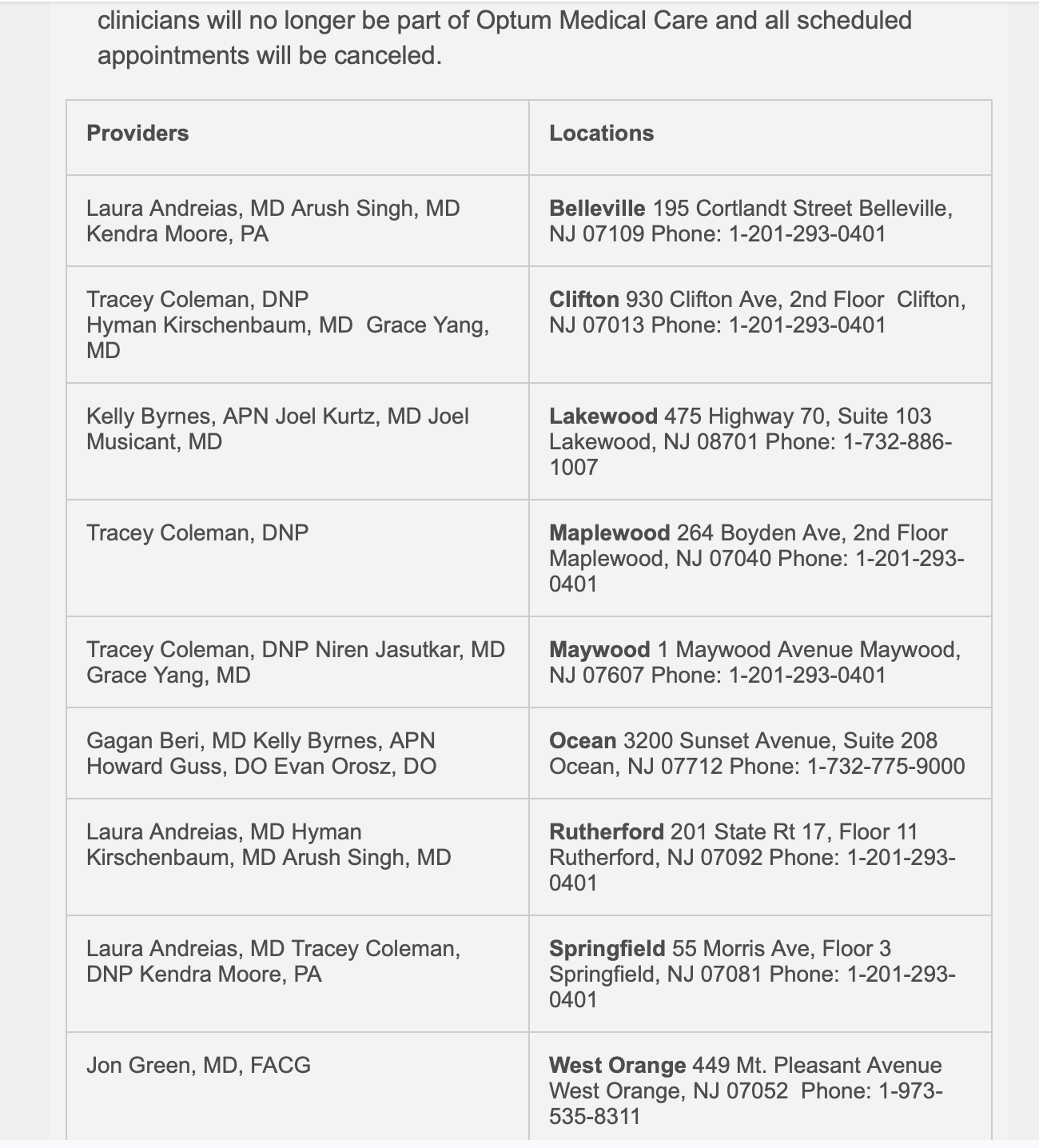 A separate email sent Monday night listed nine gastroenterology offices in Bergen, Essex, and Ocean counties that will close by Nov. 30, with more than a dozen doctors listed that will no longer be employed by the company.