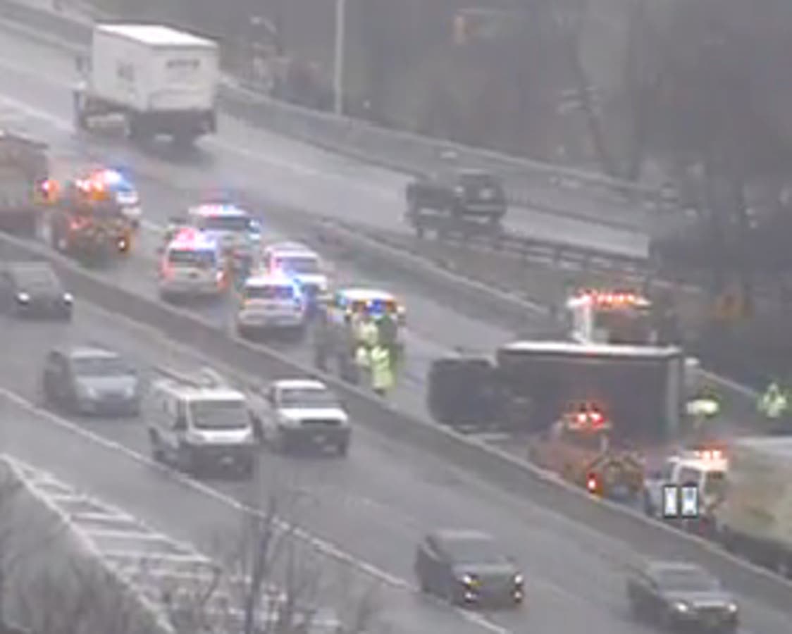 According to 511NJ.org, as of 1:51 p.m., there was an “overturned truck” on the New Jersey Turnpike - Hudson County Extension westbound, West of Interchange 14A - NJ 440/Bayonne Bridge in Bayonne.