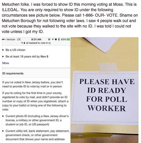 - In Metuchen, poll workers took down a sign that appeared to tell voters they needed ID to cast their ballot. No ID is required for voting in New Jersey, but some reported that people walked away from polling places after seeing the sign.
