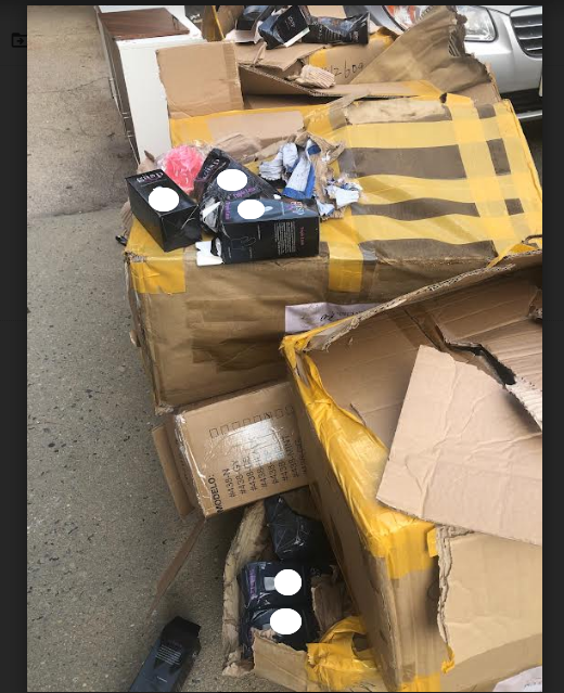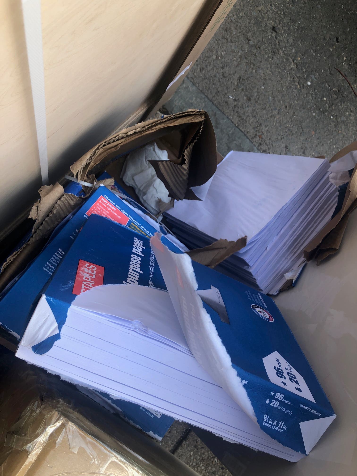 The large boxes of wrapped items were alongside what looked like damaged office furniture and several reams of paper.