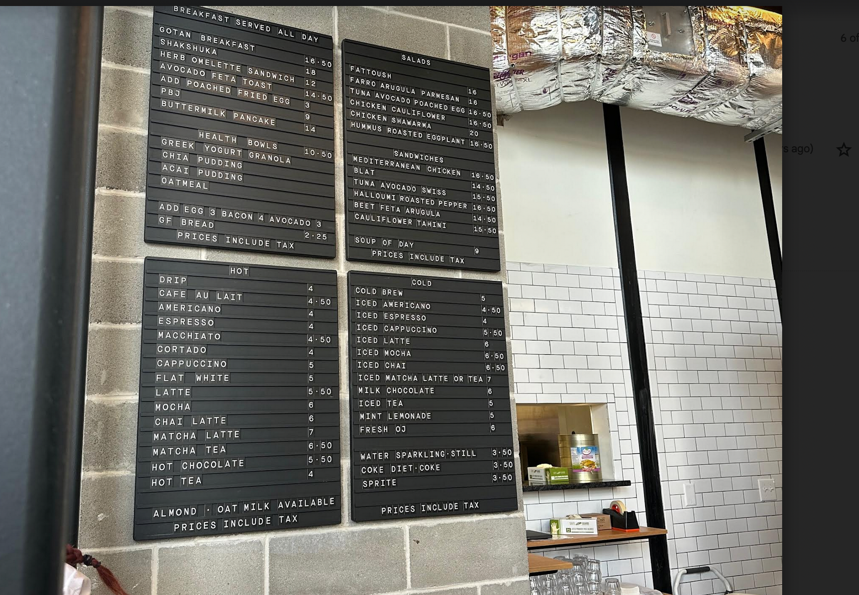 As seen on the menu (pictured below and above), the restaurant specializes in coffee and cappuccino drinks, as well as sandwiches, salads, and Mediterranean food. Prices range from $2.25 to $16.50.