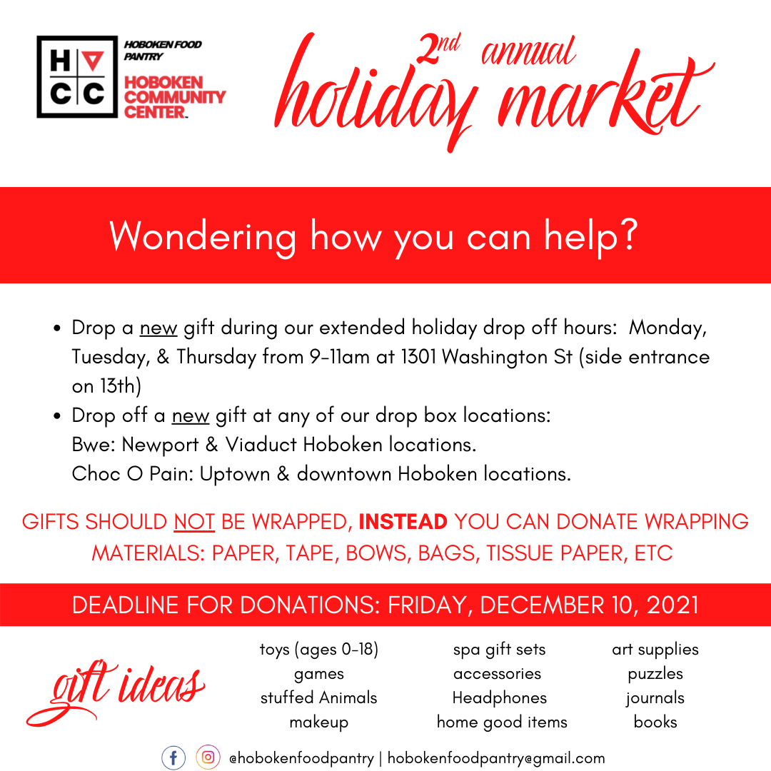 Hoboken's Community Center — which runs a food pantry that also gives out toiletries and diapers for those in need — is seeking donations for their second annual "holiday market" for needy clients. Residents donate gifts, and needy people can "shop" at the market to pick out items for their loved ones.