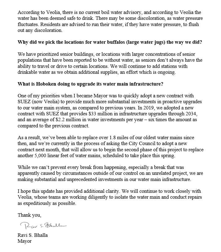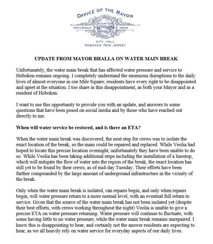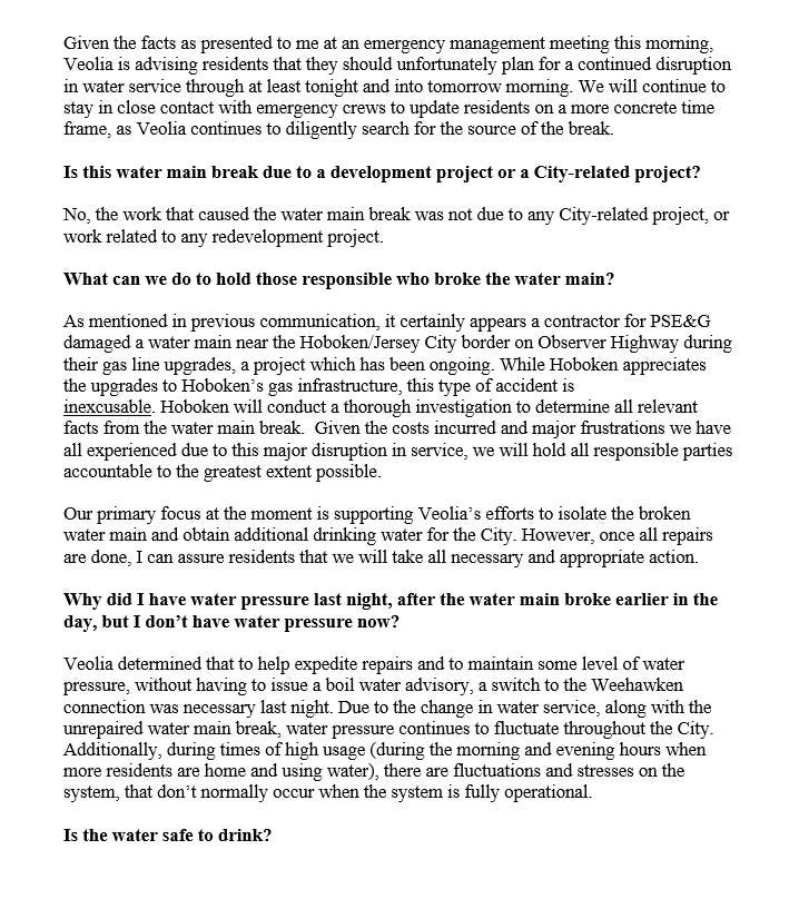 Overnight, Veolia transitioned the City from the Jersey City water feed to the Weehawken feed. While a larger number of residences have access to water, those living in buildings on higher floors may continue to have low to no water pressure. Veolia remains on site and is attempting to isolate the broken main while not cutting water to the entire city. They are getting closer to identifying the exact location of the break, but because of the complexity of the water main infrastructure at that location and the interconnectivity with Jersey City, they have been unable to isolate the broken main.