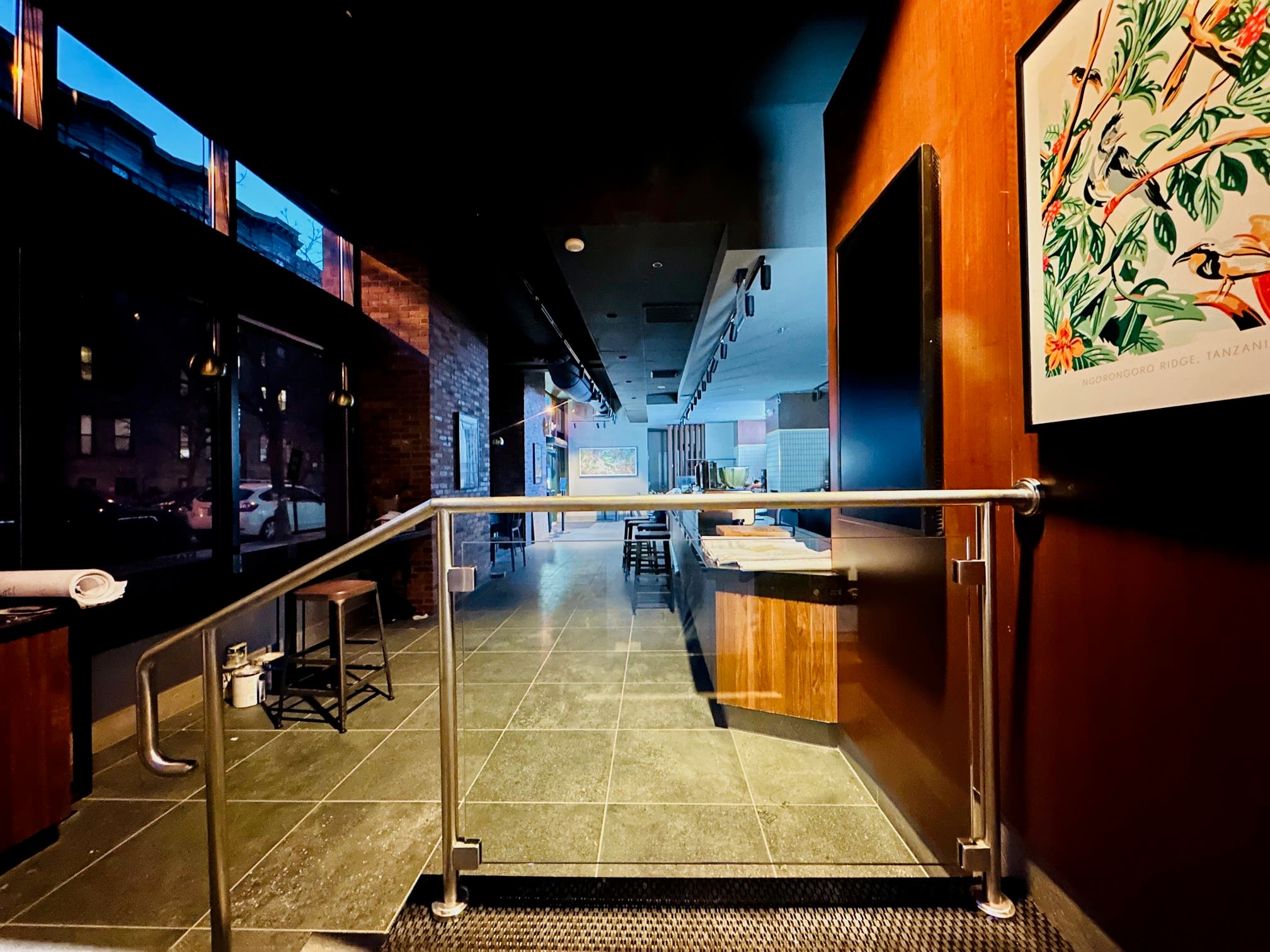 Workers were inside the store on Monday, and renovations appeared almost complete. The long table has been removed and seating appears to be set up along the windows, with the ordering counter now extending the length of the store, and no back seating area. There is a table with seating near the Hudson Street entrance.