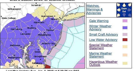 Get ready for some more messy weather. A winter weather advisory is in effect for most of New Jersey – particularly the central, southern and Jersey Shore areas – from 1 to 9 p.m. on Monday.