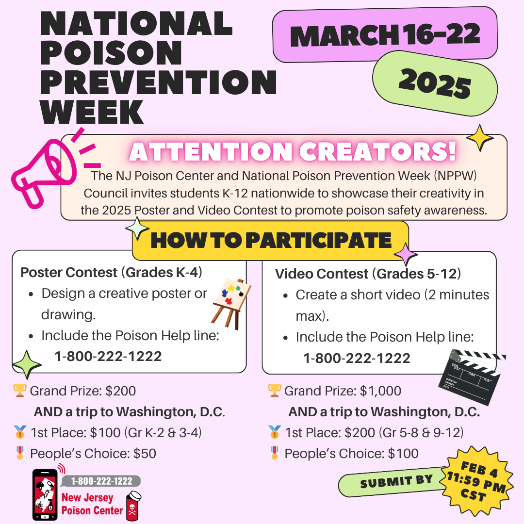 The National Poison Prevention Week (NPPW) Council is hosting its annual Poster and Video Contest to raise poison safety awareness for students K-12 nationwide. The 2025 theme is “When the Unexpected Happens, Poison Help is here for you.” You can help tell your friends about poison dangers and how to stay safe from poisoning!