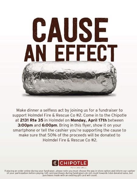 All orders at the Chipotle on Rt. 35 in Holmdel between 3 and 6 p.m. Monday give 50 percent to Holmdel Fire and Rescue Co. 2.