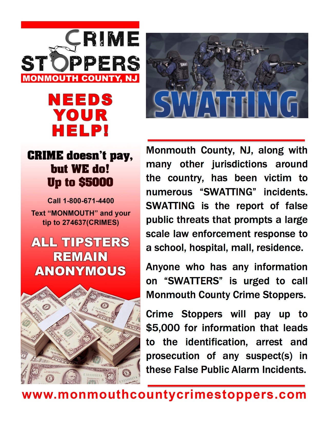 Monmouth County Crime Stoppers is offering a reward up to $5,000 for information leading to the prosecution of anyone involved in swatting.