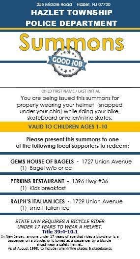 HAZLET, NJ — For the rest of the month of August, through Sept. 10, Hazlet police will be handing out "summonses" to kids who they see properly wearing their helmets while bike riding, skateboarding or on a scooter.