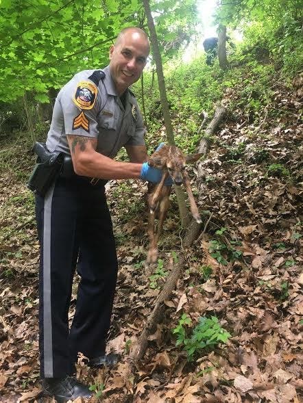 The officers picked the two fawns up and carried them back up the hill into the woods. The mother deer was not spotted.