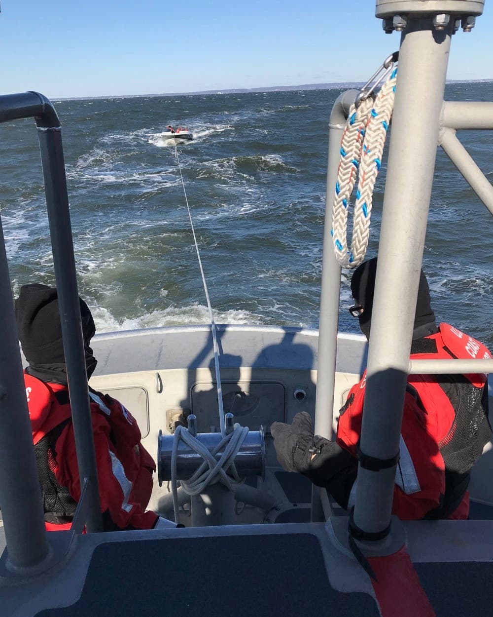 The U.S. Coast Guard, stationed at Sandy Hook, received a call at about 9:00 a.m. Friday, requesting help for three individuals who were experiencing engine problems and did not have a working marine radio aboard their 18-foot-boat. It's not only frigid out; there are 25-knot winds and three to five-foot seas; a small-craft advisory had previously been issued.