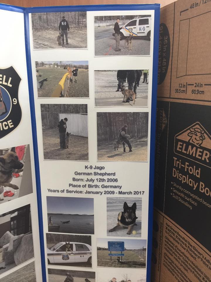 Bondarew's K9 partner Jago will soon be retired, Kudrick said. Jago has been in service as a K9 officer since January 2009, and a posterboard of photos of Jago notes he is scheduled to retire in March.