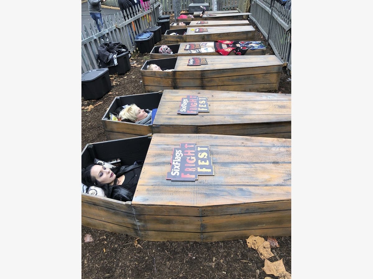 She and the other five Coffin Dwellers are now taking on the challenge to lie in their wooden coffins for 30 hours this weekend. They will have a 6-minute bathroom break each hour, limited cell phone usage, meals in their coffins and unannounced visits from the Fright Fest freaks.