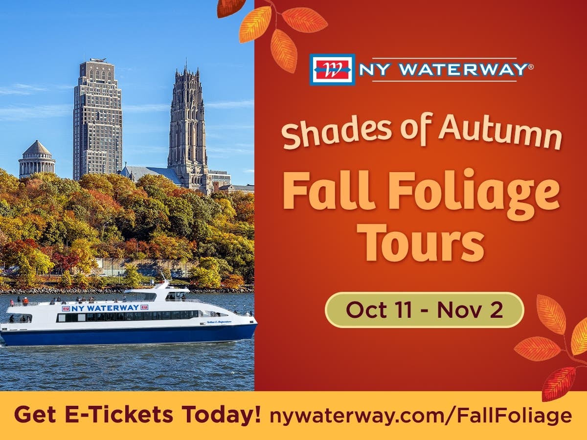Tickets are on sale now for NY Waterway’s “Shades of Autumn” Fall Foliage Tours, offering passengers unique on-water views of the spectacular fall scenery along the Hudson River. The weekend tours begin October 11 and run through November 2, with departures from the Midtown/West 39th Street and Port Imperial/Weehawken ferry terminals.